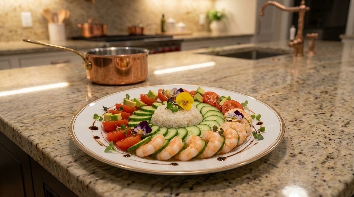 Порция коричневого риса, свежий овощной салат и креветки, слегка обжаренные с чесноком. Морепродукты дают быстрый белок, а салат делает ужин лёгким и очень приятным.