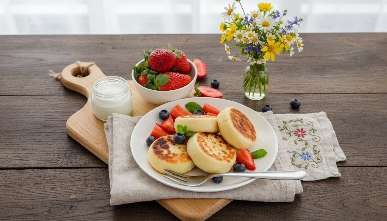 Сырники из творога с небольшим добавлением овсянки или цельнозерновой муки. Их можно практически не жарить — готовить в духовке или на сухой сковороде. Подавайте с ягодами и ложечкой натурального йогурта. Это белковый и приятный завтрак, который хорошо насыщает и не даёт тяжести.