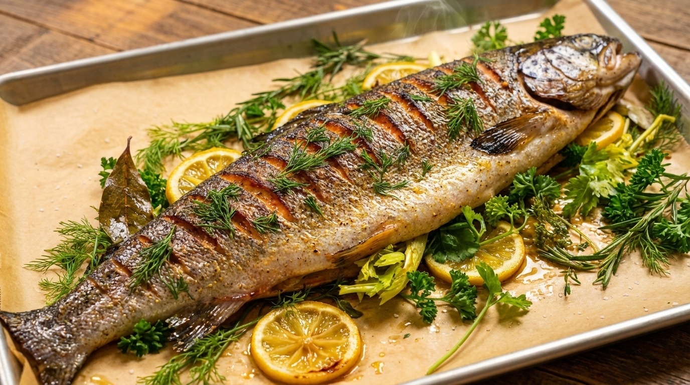 Форель — идеальная рыба для праздничного стола. Она не требует сложной подготовки, быстро запекается и всегда выглядит достойно. Чтобы подчеркнуть её естественный вкус, достаточно приготовить ароматное масло: измельчённые травы, немного лимонной цедры и капля оливкового масла. Такое масло выкладывается поверх рыбы перед запеканием, что создаёт мягкий аромат и лёгкую корочку. Форель получается тающей и очень нежной. Подача тоже проста: несколько долек лимона и свежая зелень делают блюдо завершённым без лишних усилий.