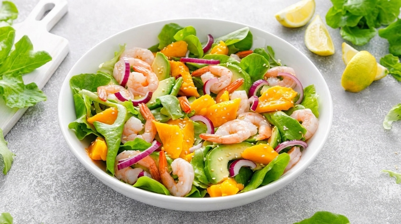 Креветки и манго — сочетание, которое всегда вызывает ощущение праздника. В ПП-варианте салат получается особенно свежим и приятным. Основа проста: листья салата, креветки, манго, немного огурца и лёгкая заправка из оливкового масла и лимонного сока. Манго добавляет натуральную сладость, а креветки дают нужный белок. Такой салат освежает, помогает разбавить более плотные блюда и создаёт ощущение продуманного, лёгкого праздничного меню.